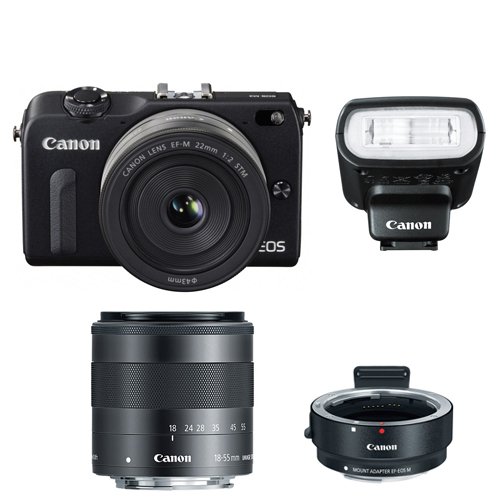 All images of Canon EOS M2 Camera w/ EF-M 22MM f/2, 18-55MM F/3.5-5.6 IS EF-M Lens, 90EX Flash & EF-M Adapter (Black) - International Version (No Warranty)