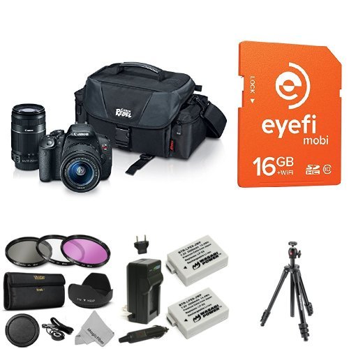 All images of Canon EOS Rebel T5i with EF-S 18-55mm f/3.5-5.6 IS II Lens, EF-S 55-250mm f/4.0-5.6 IS II Telephoto Zoom Lens, Wi-Fi Memory Card, Battery, Tripod, Filter and Rebel Gadget Bag