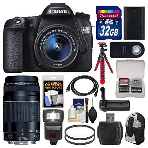 Canon EOS 70D Digital SLR Camera & EF-S 18-55mm IS STM Lens with 75-300mm III Lens + 32GB Card + Backpack + Flash + Battery + Grip + Flex Tripod Kit